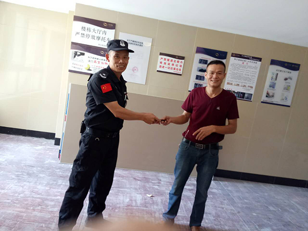 8月14日下午13點35分左右,和合三期值班保安黃永術在19幢拾得蘋果手機一部,想著失主很著急,手機里信息多,就在大廳來回走動,耐心等待失主來認領,大約過了20分鐘,一位姓曾的男子勿勿趕來,"保安大哥,看見一部蘋果手機沒有?”在確認了男子的身份后,黃永術將手機“完璧歸趙”。心急如焚的曾先生拿到失而復得的手機后,激動地一個勁兒說謝謝。