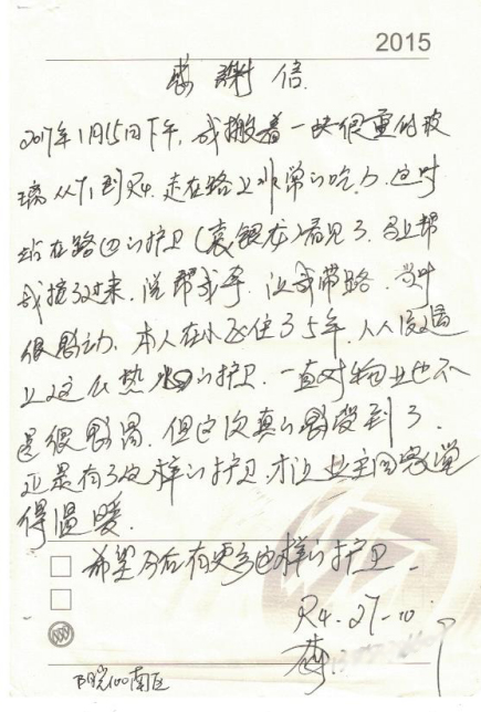 “我幫您,您在前面帶路”2017年1月15日下午,陽光一百小區內外,業主李女士(化名)正將一塊玻璃從T1樓搬到R4樓,寒冷的冬天加上玻璃的重量完全超過了預期,李女士的雙手已被凍僵,寸步難行。這時,正在執勤的中威戰士袁銀龍見狀,立刻小跑上前幫忙。一句簡單的話語,卻溫暖了業主的心。袁銀龍貼心的服務,熱心助人的舉動深深地感動了業主李女士。于是,當天她就親手寫了一封感謝信交到護衛點管理人王天平處,表揚保安員袁銀龍熱心助人的行為。