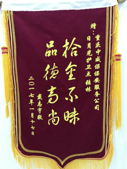 原來1月14日晚23點10分,中威戰士張林巡查至Bl層地鐵口時,拾得一部蘋果7。對于從事保安工作的張林來說,這樣一個手機的價值已經是他幾個月工資了。第一次撿到如此貴重的手機,張林的心中卻沒有絲毫猶豫,第一時間將此事上報給了保安隊長。經過多方面的打探,找到了失主物歸原主。為表示感謝,失主特地制作了錦旗一面,感謝張林拾金不睞,感謝培養張林的中威保保安服務公司。