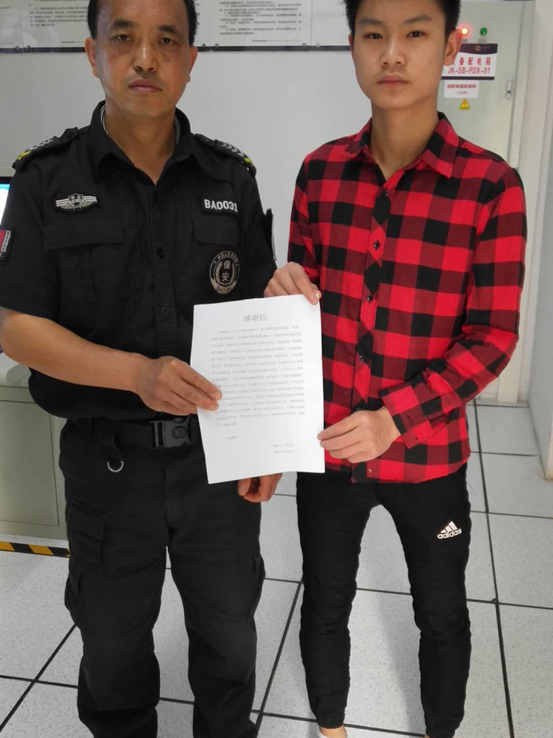 無獨有偶,5月12日上午9點左右,中威戰士簡勇在洗手間的垃圾桶旁邊拾到一個錢包,包內有身份證、銀行卡以及乘車卡等重要證件。簡勇立即向值班長程世倍匯報情況并將錢包交到了執勤前臺。下午6點左右,失主劉先生委托自己的朋友幫忙前來找尋,中威戰士簡勇通過電話連線失主,在核實失主的身份信息后,將錢包交與失主朋友,為了表示感謝,失主還特意讓他朋友代寫了一封感謝信。