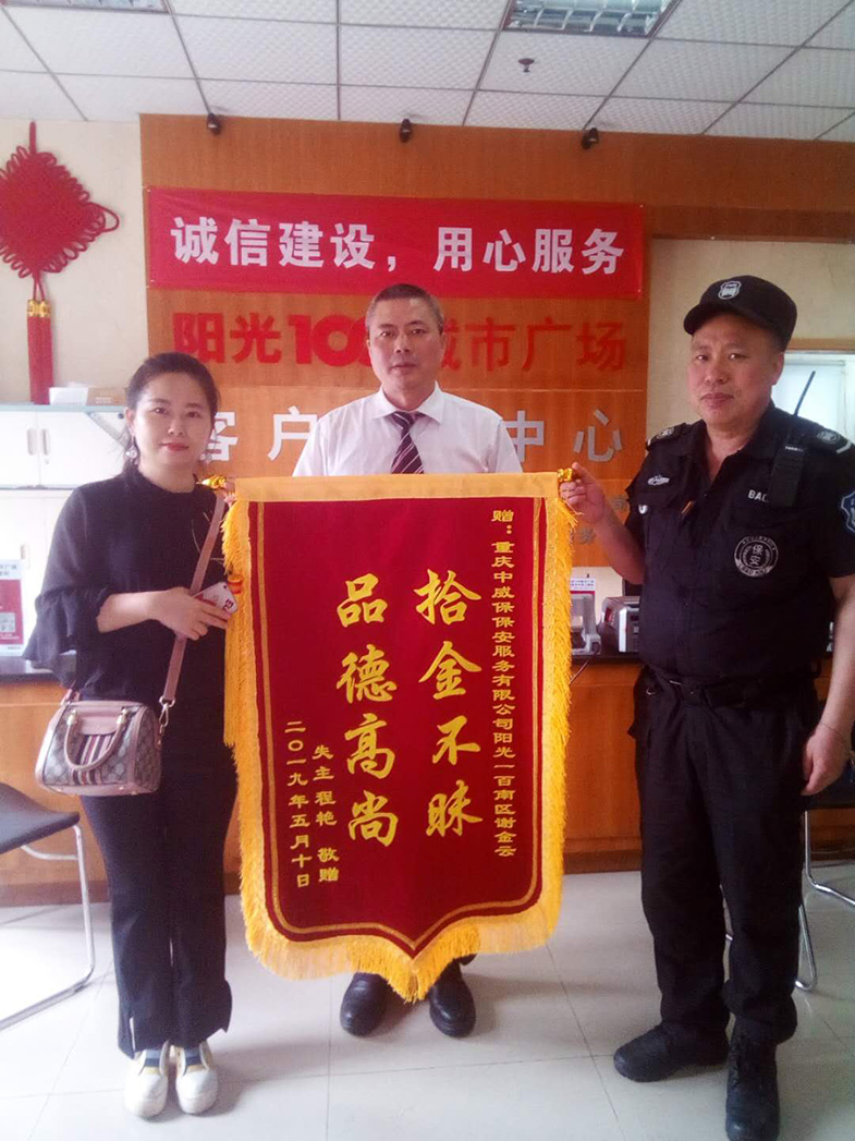 下午3點45分,程女士來到客服中心領取失物,經客服中心人員仔細核實后將手機物歸原主。5月10日,程女士送來一面寫有“拾金不昧 品德高尚”的錦旗表示感謝。