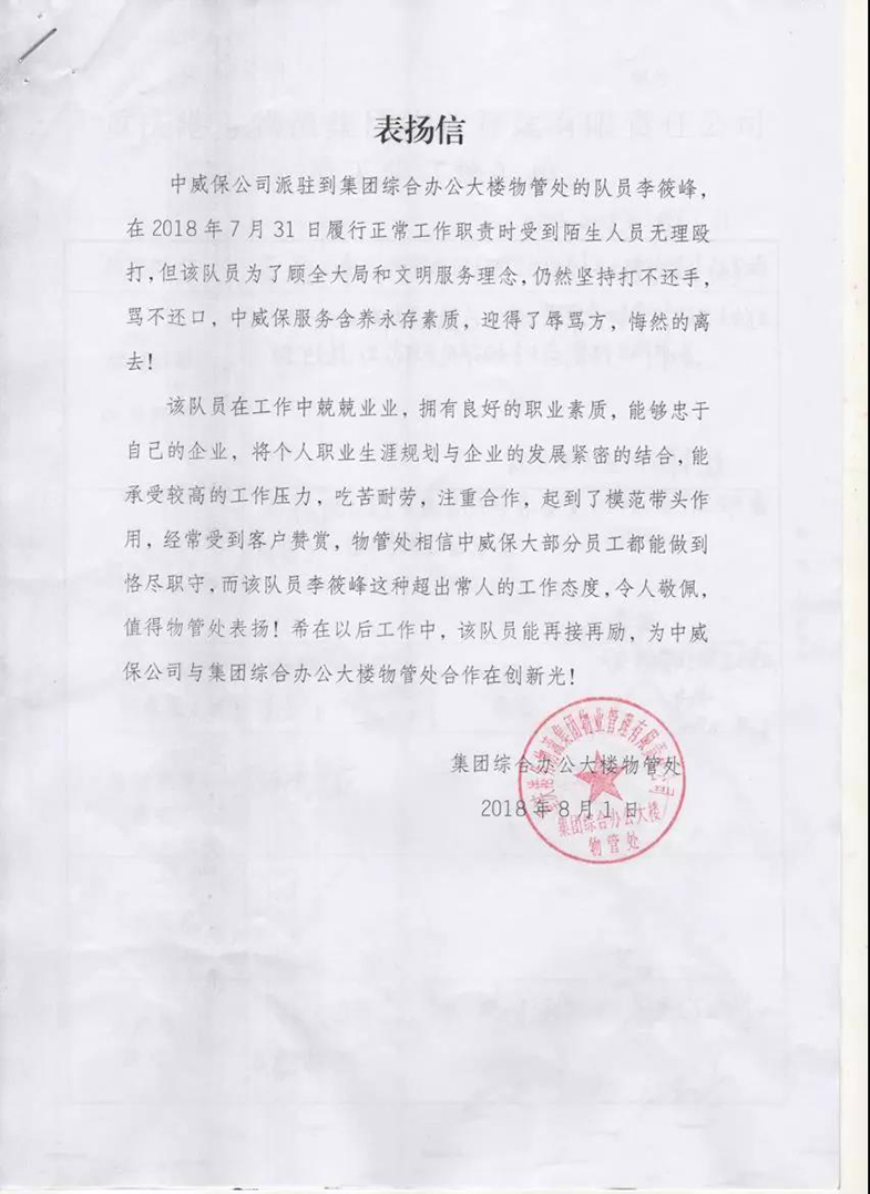 2018年7月31日晚上,我司港務大樓隊員李筱峰在履行正常工作時受到陌生人員無理毆打,但該隊員為了顧全大局,仍然堅持文明執勤,李筱峰的工作態度令人敬佩,為了表示鼓勵,重慶港務物流集團特通報表揚,希望在以后工作中,該隊員能再接再勵,為中威保與港務集團的合作再創新光!