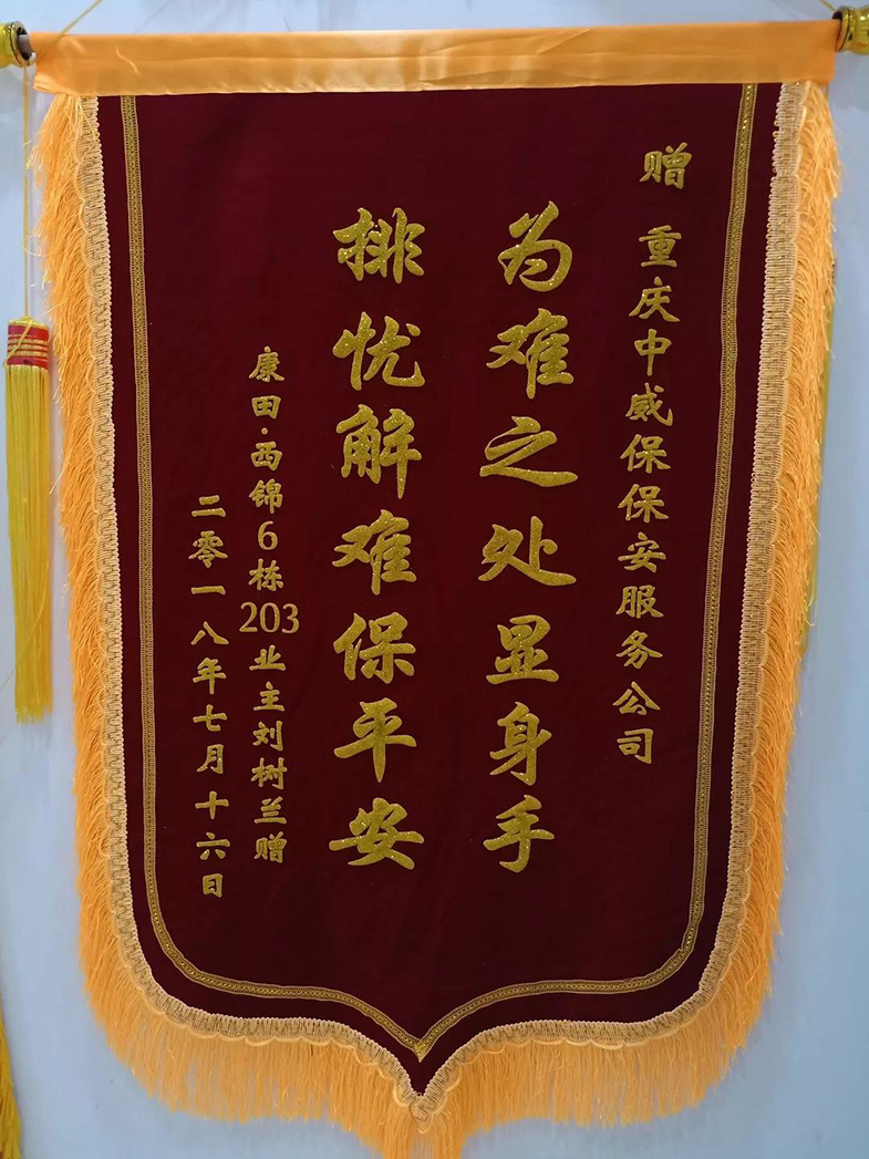 2018年7月16日,我司駐康田西錦巡邏隊員張勇在巡邏時聽到一位老人的求救聲。原來,老人今年87歲了,家里又沒人,自己一人在衛生間時意外滑到,無法起立。見此,張勇立即趕到事發地點,同時通知值班班長陳剛。為了確保老人安全,張勇從落水管爬到4樓的防盜網上進入衛生間,同時通知120救護車趕到現場,最終老人得到解救。為了表示感謝,老人特送來錦旗一面。