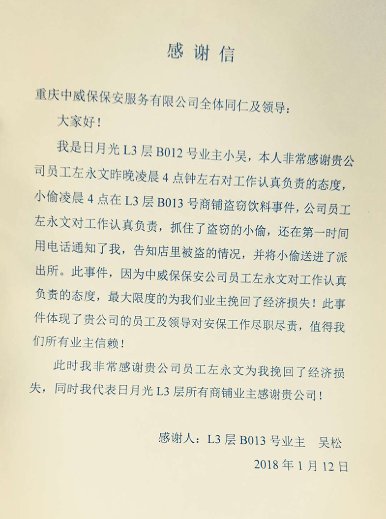 1月12號晚上凌晨4點左右,中威保駐日月光的巡邏隊員左永文發現盜竊商鋪的小偷后,在第一時間聯合其他幾名隊員將其扭送派出所,最大限度地為業主挽回了經濟損失,中威保人認真負責的工作態度再次得到了業主的贊揚與情真意切的感謝。