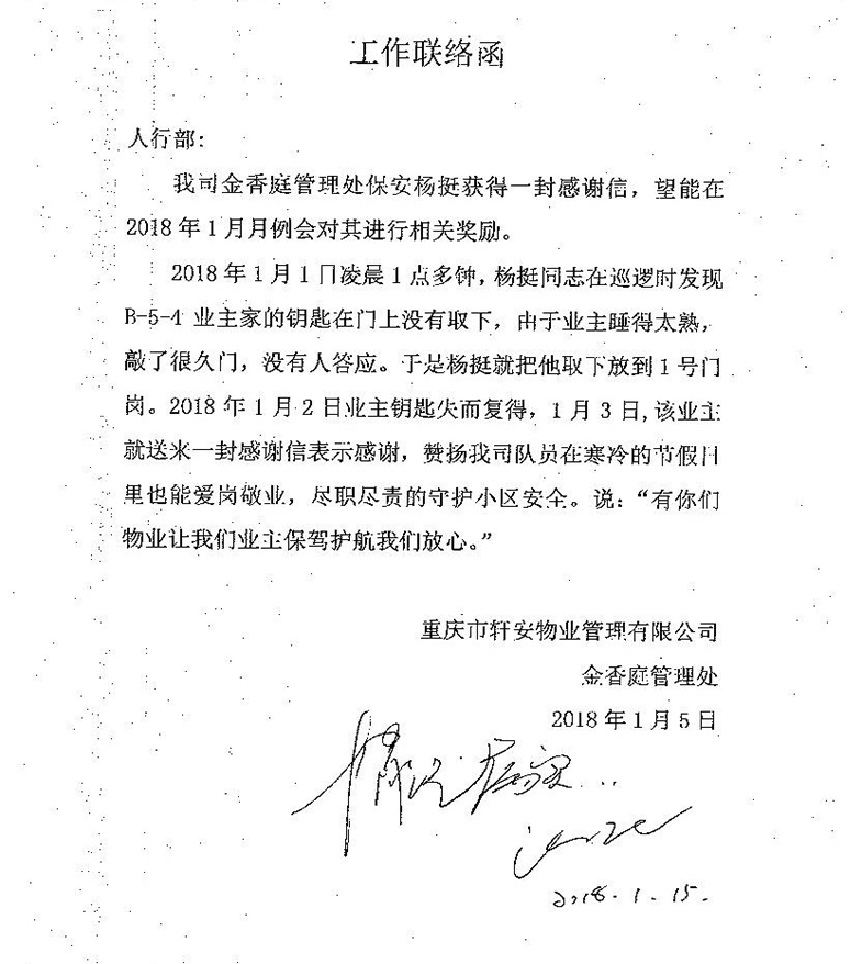 來自軒安物業的保安員楊挺認真盡責的工作態度與全心全意為業主著想的品質深深感動了業主,他們在第一時間送來感謝信,贊揚中威戰士楊挺盡職盡職。
