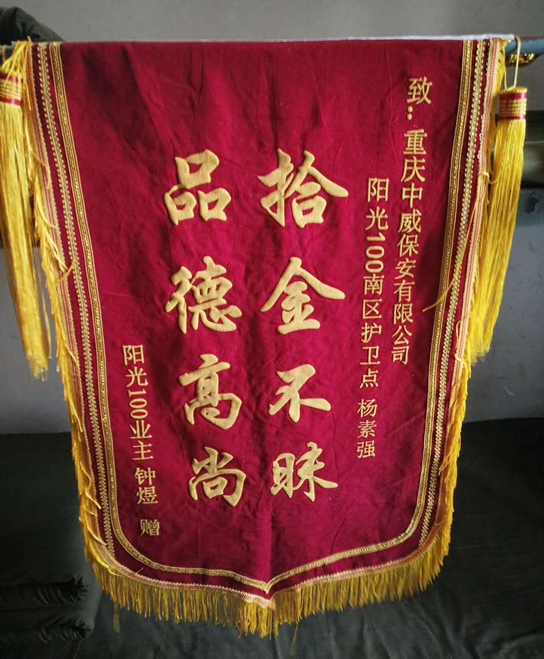 原來,8月19日晚21時15分,陽光100南區護衛點夜班隊員楊素強照例在日常巡邏,突然他發現大廳有一個錢包,此時,夜里來往人員較少,見四周無人尋找遺失物品,楊素強立即上報給值班班長,并和班長一起尋找失主信息。經檢查,里面有銀行卡數張、社保卡兩張、駕駛證一本、身份證一張、現金數張。“錢包里證件很多,失主肯定急壞了,我們立馬開始尋找業主相關信息,并及時上報給派出所”楊素強說。在多方查尋失主信息后,終于找到電話號碼與失主取得了聯系。聽到錢包被中威戰士撿到了,鐘先生長舒一口氣。對失主身份和錢包里的物品核實和確認之后,鐘先生高興地領回了自己的錢包,并表示一定要贈送一面錦旗給撿到錢包的隊員。